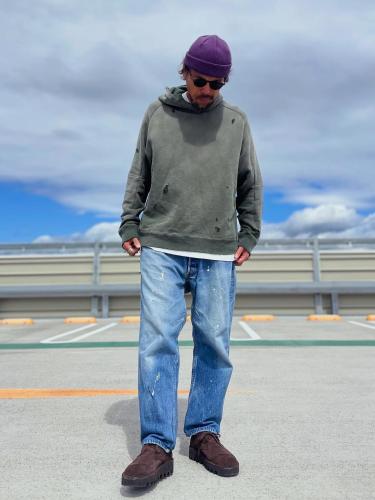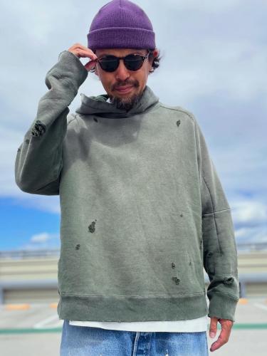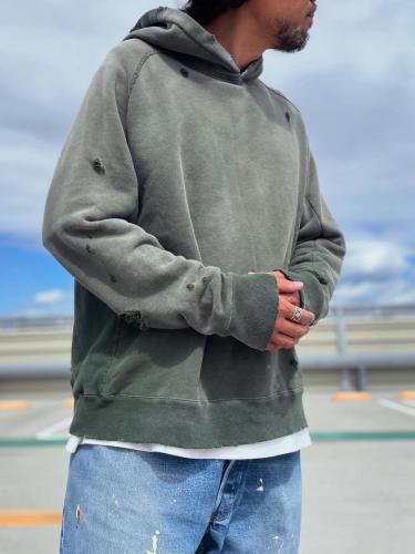 実際にサンフェードした様なリアルな色落ちと、随所に施したダメージ加工が魅力のスウェットフーディー。