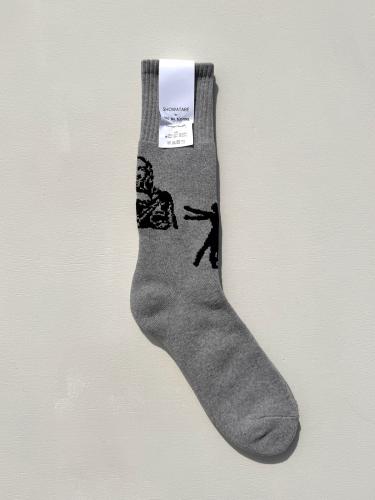 左右それぞれに違うレオナルド・ダ・ヴィンチをモチーフにし絵柄を編み込んだパイル編みソックス。