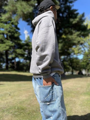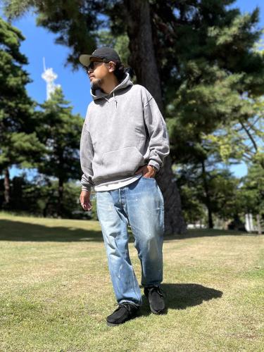 8オンスの程良い厚さの生地に、ピグメント(顔料染)することでアタリ感と全体的にフェード感のある表情が魅力です。