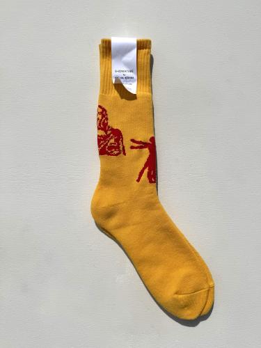 左右それぞれに違うレオナルド・ダ・ヴィンチをモチーフにし絵柄を編み込んだパイル編みソックス。